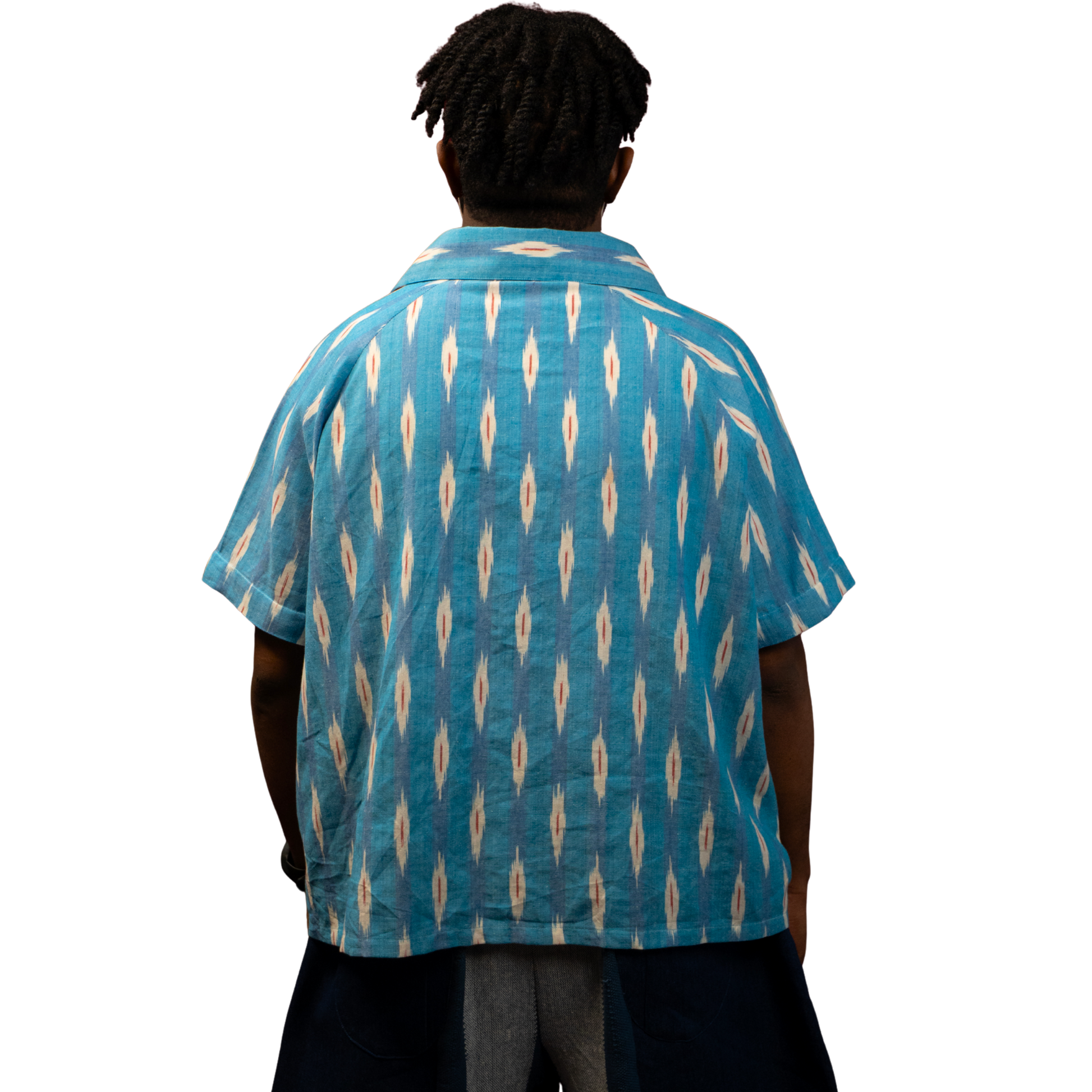 A boxy-fit shirt crafted from handwoven blue ikat, featuring detachable corduroy sleeves for modular wear. Designed to transition between full-sleeve and short-sleeve forms.