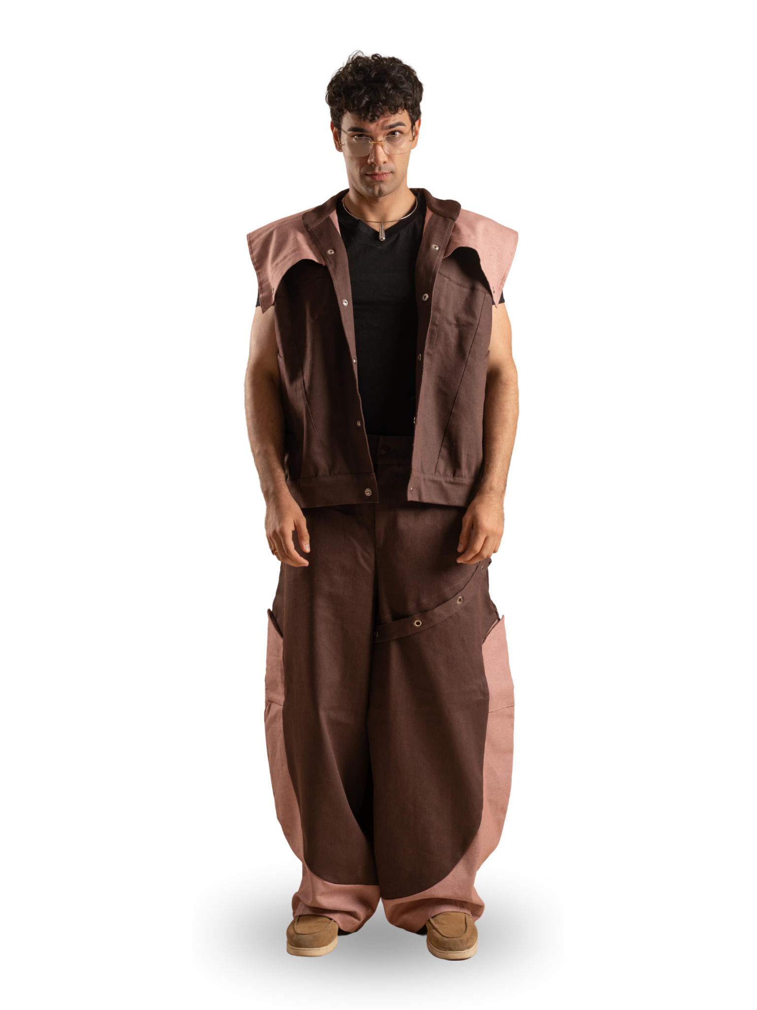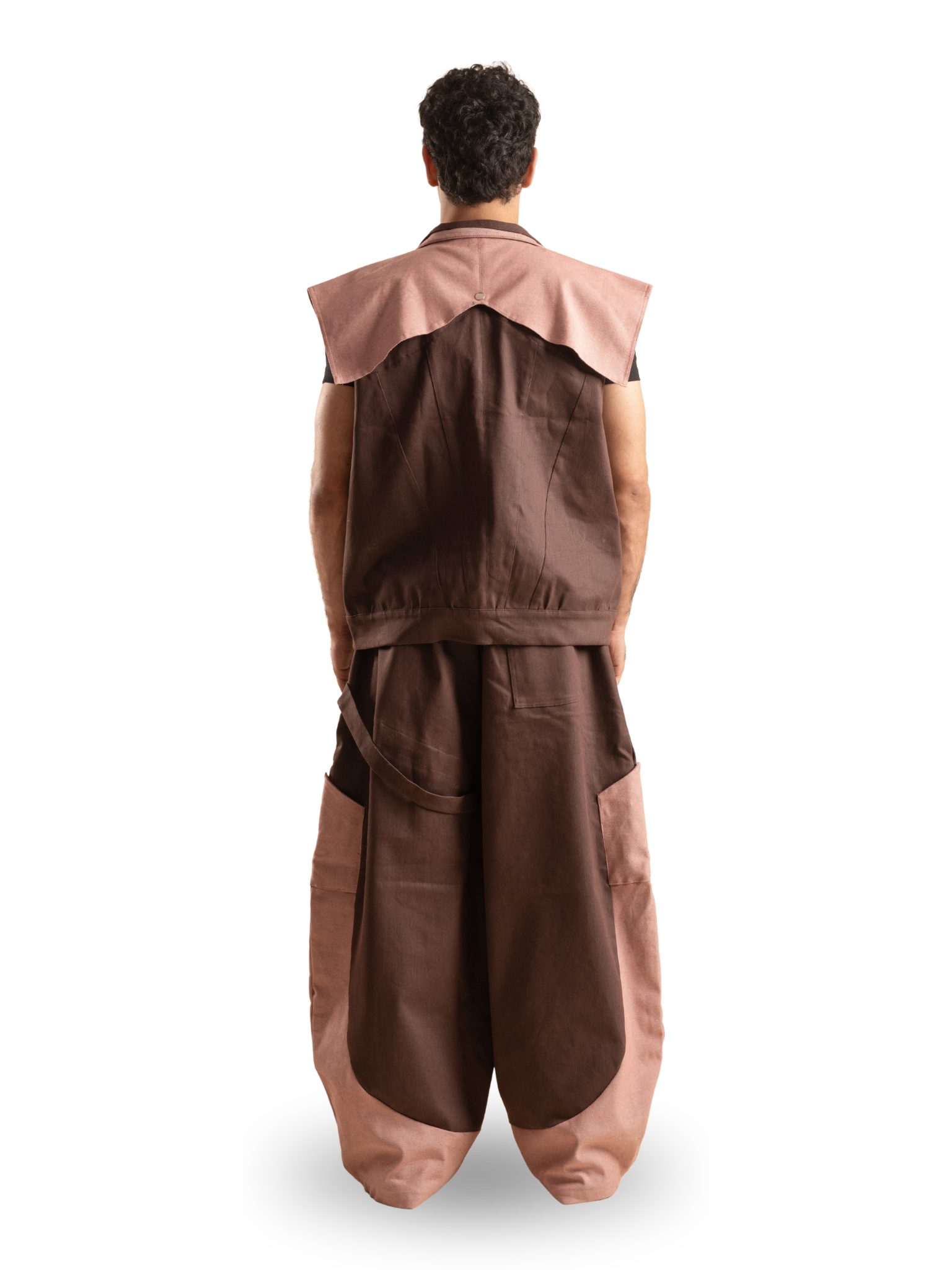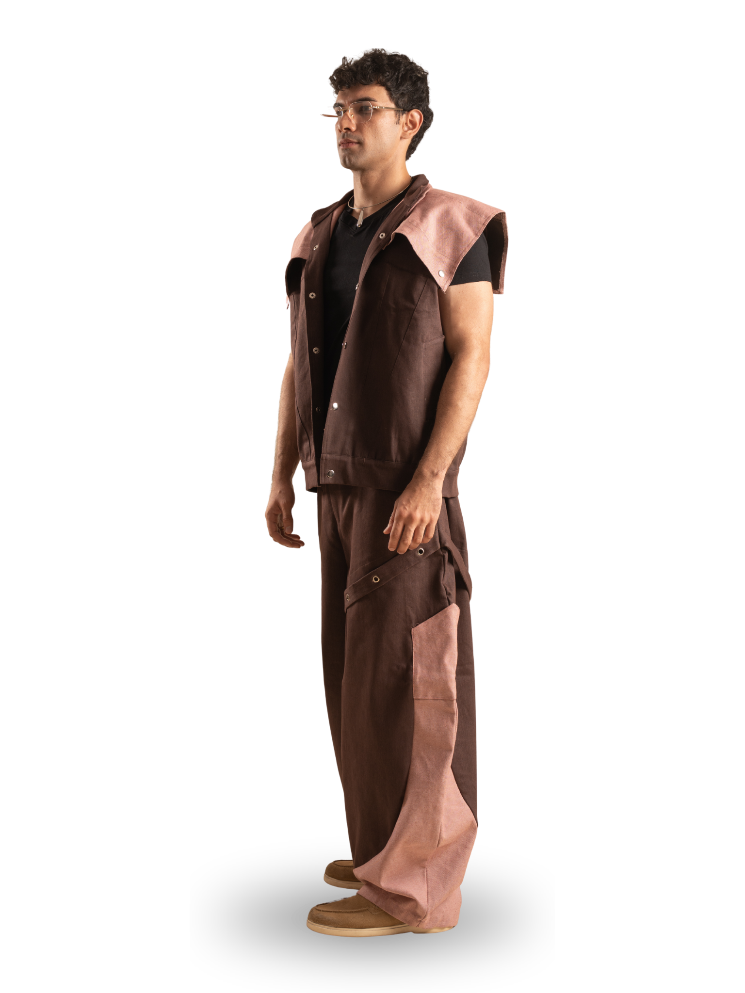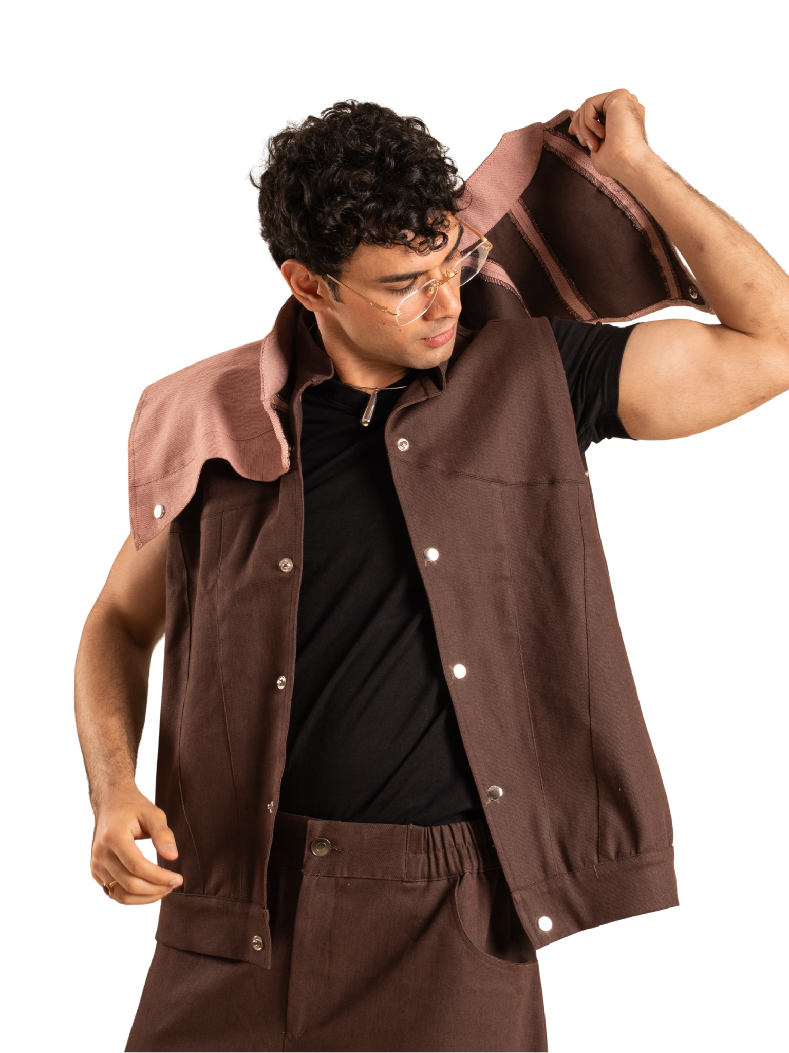 Pink collar and Maroon denim paneled vest with snap buttons and front pockets. Collar is detachable and buttons are to easy to snap in and out. Oversized and relaxed fit for styling.
