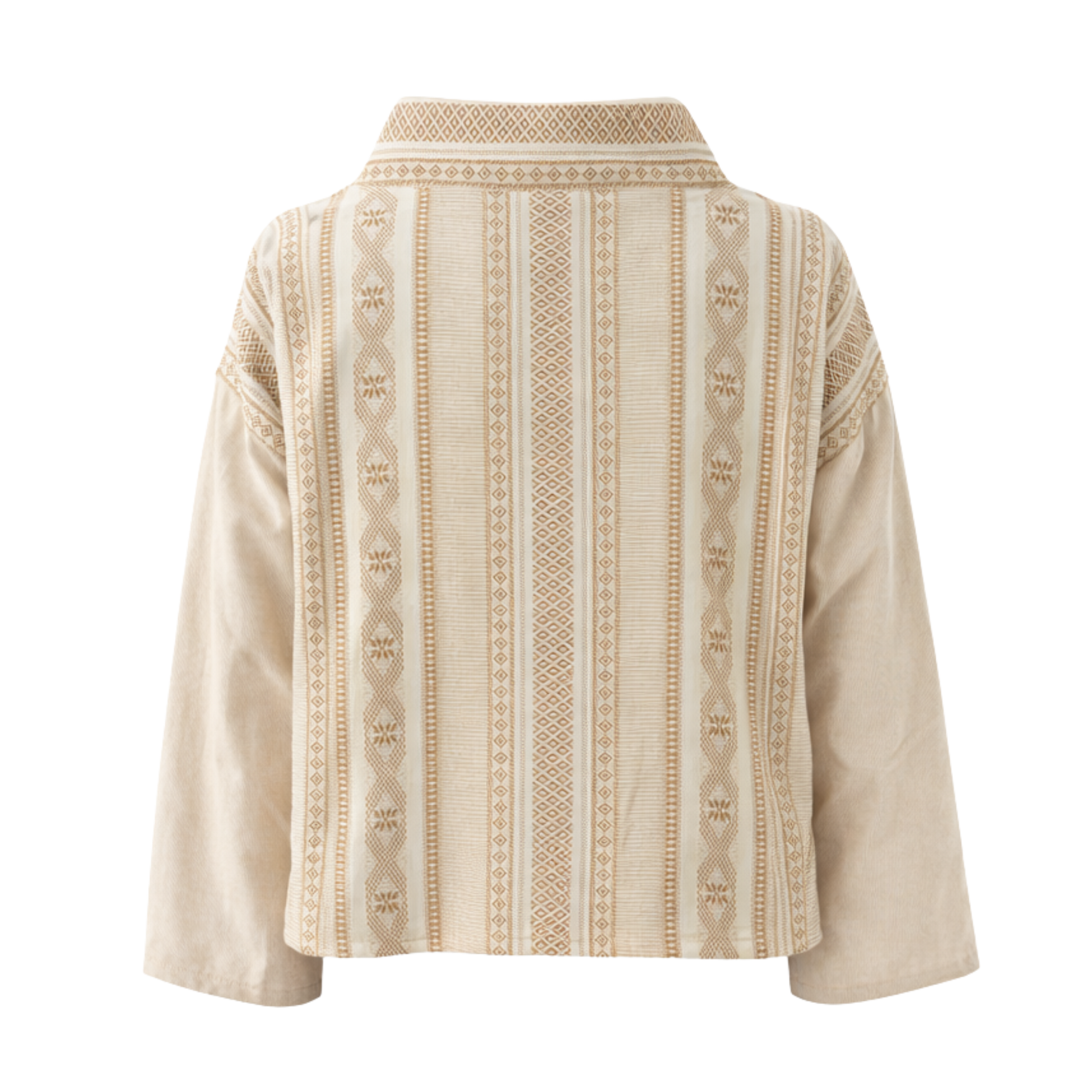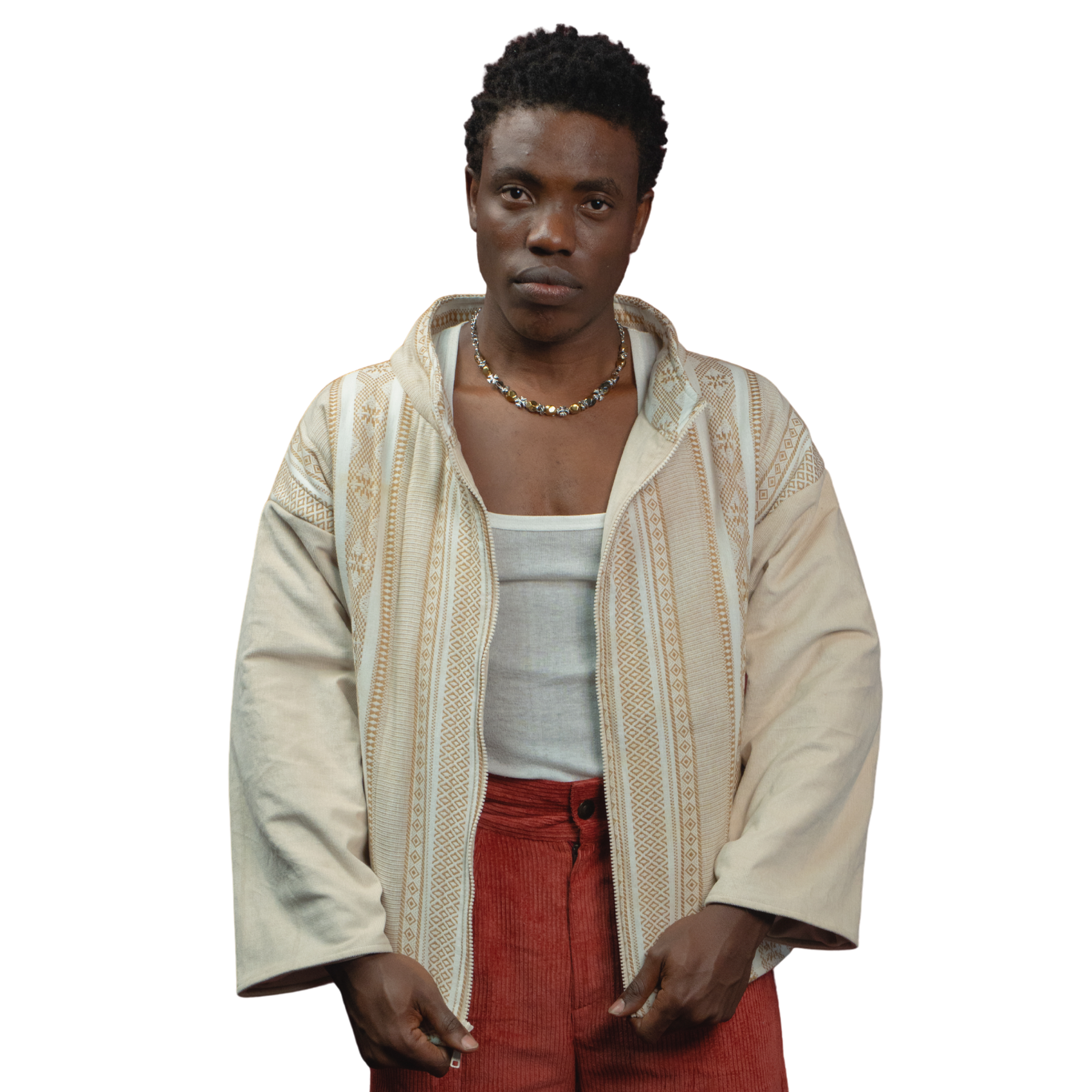 This beige jacquard bomber is one of those pieces you keep reaching for. Easy, boxy fit with subtle thread work inspired by Toda embroidery, adding depth without trying too hard. Finished with a warm fleece lining inside, the jacket balances artisanal detail.